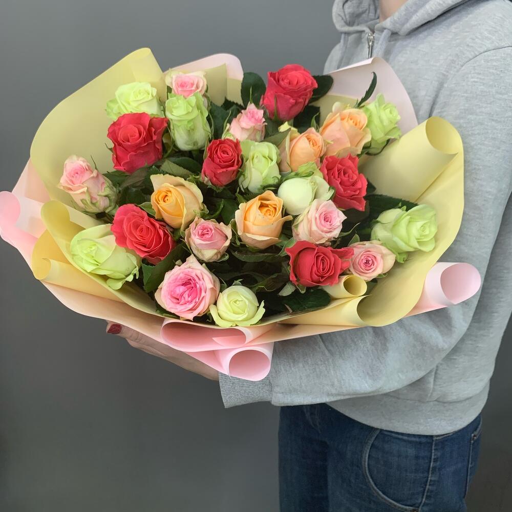 Все женщины любят цветы, но большинство из них предпочитает розы. Еще бы, ведь они завораживают своей красотой и покоряют своим ароматом.Прекрасный букет из разноцветных роз, станет идеальным подарком для самых любимых и близких!Памятка для букета:1. Чистая вода раз в сутки.2. Стебли подрезаем на 0,5см при каждой смене воды.3. Ставим в прохладное место, но не у окна.4. Чтобы вода оставалась свежей, не допускайте попадания листьев и лепестков в воду.Друзья, обратите внимание, что цвет упаковки может быть другим, в зависимости от наличия на складе.
