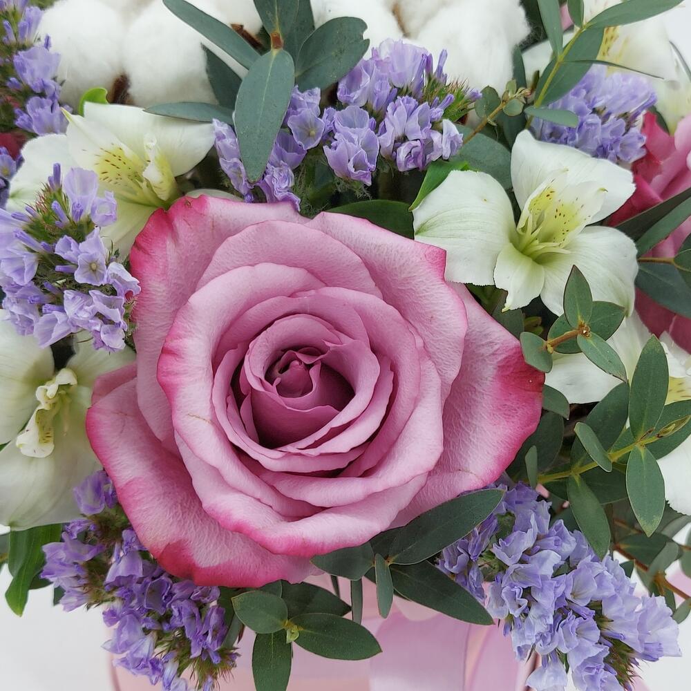 Розы, альстромерия и хлопок в коробке “Сиреневые облака”