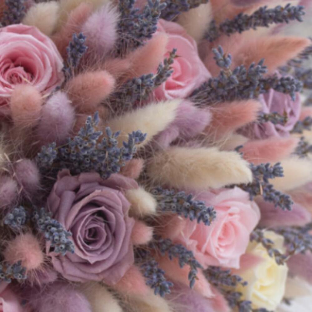 Лагурус (сухоцвет) – 30 шт.Лаванда (сухоцвет) – 35 шт.Роза – 15 шт.Лента атласная – 1 шт.