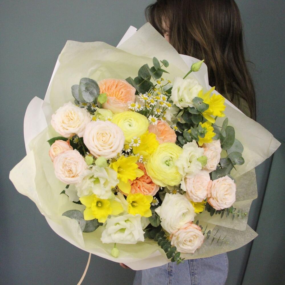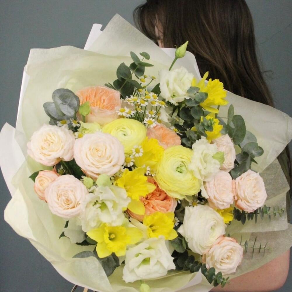 Нарцисс – 7 шт.Ранункулюс – 3 шт.Ромашка – 3 шт.Роза кустовая пионовидная – 3 шт.Роза пионовидная – 3 шт.Лизиантус – 5 шт.эваклипт – 3 шт.Упаковка – 1 шт.