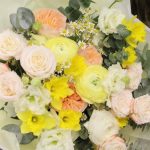 Солнце в руках, букет с ранункулюсами, ромашками и пионовидными розами