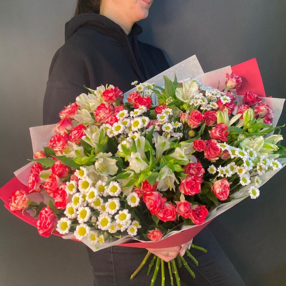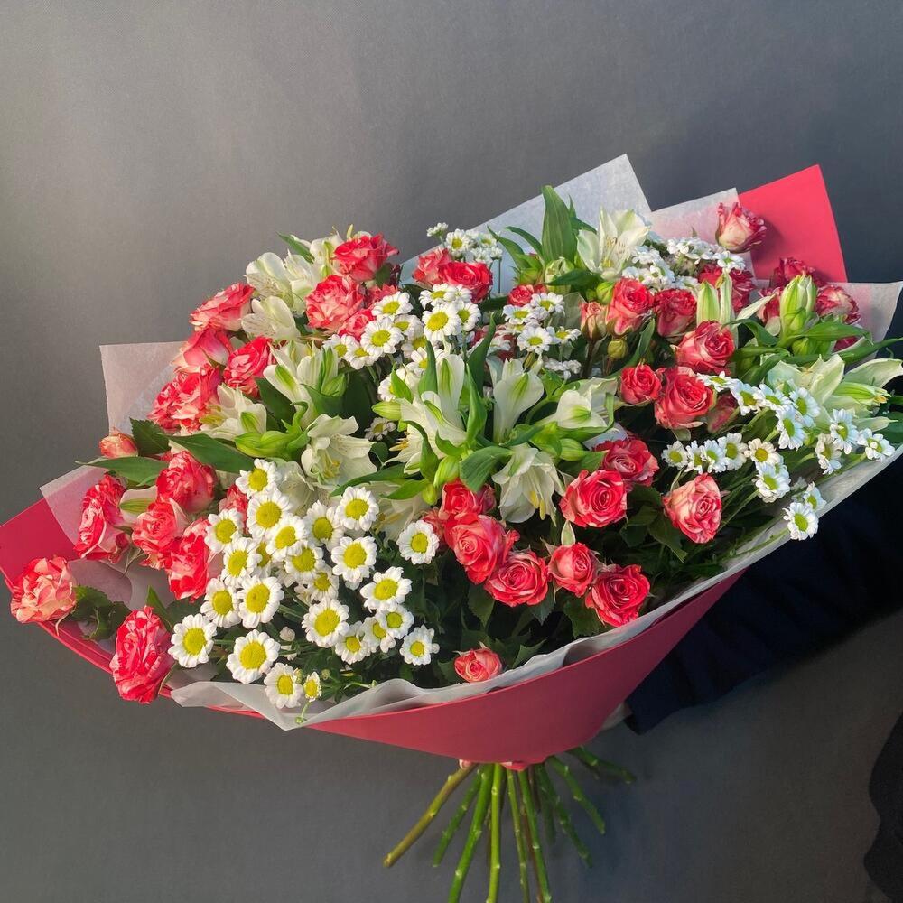 Альстромерии, Гвоздики, Кустовые розы, Лизиантусы, Розы, Хризантемы