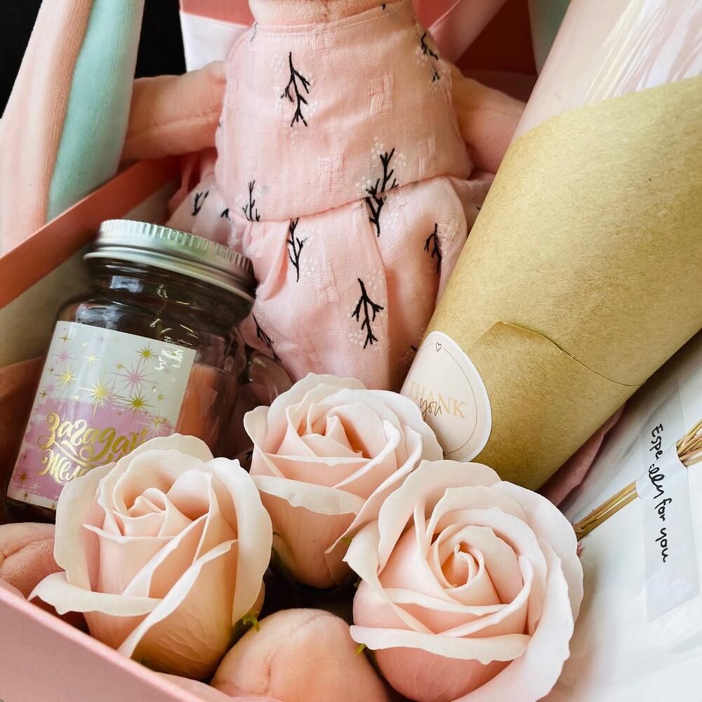 Коробка – 1 шт.Заяц плюшевый – 1 шт.открытка дизайнерская – 1 шт.свечи ароматические – 1 шт.букет из сухоцветов – 1 шт.роза мыльная – 3 шт.