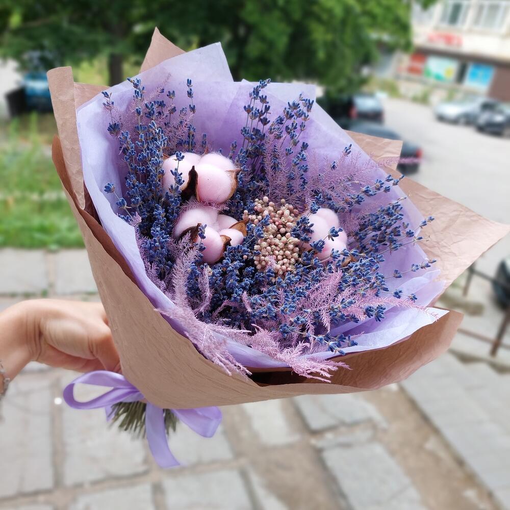 Озотамнус – 1 шт.Хлопок – 3 шт.Лента атласная – 1 шт.Упаковка дизайнерская – 1 шт.Лаванда (сухоцвет) пучок – 50 шт.Аспарагус крашенный – 2 шт.