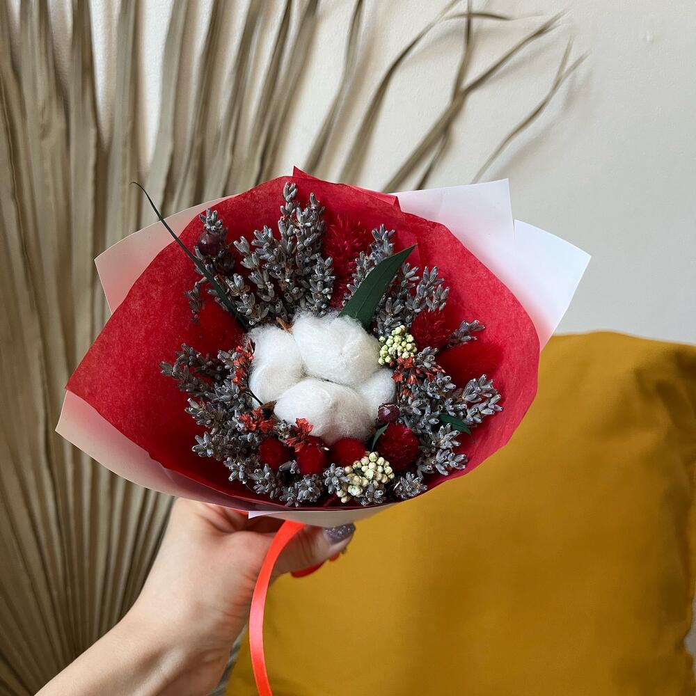Лаванда – 45 шт.Хлопок – 1 шт.Лагурус – 6 шт.Фаларис – 3 шт.Эвкалипт стабилизированный – 3 шт.