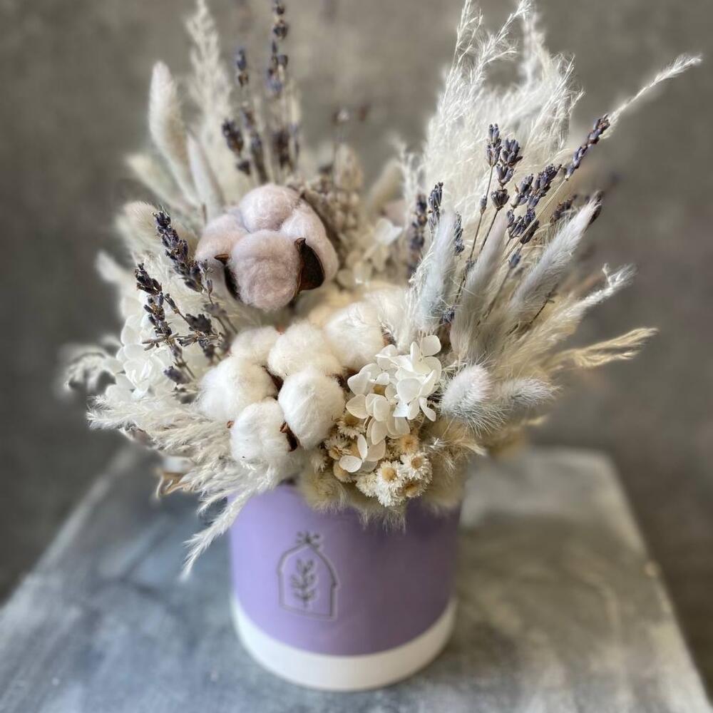 Кашпо керамическое – 1 шт.Хлопок натуральный – 5 шт.кортадерия – 1 шт.Лагурус (сухоцвет) – 25 шт.Лаванда – 40 шт.гортензия стабилизированная – 1 шт.анафилис – 5 шт.