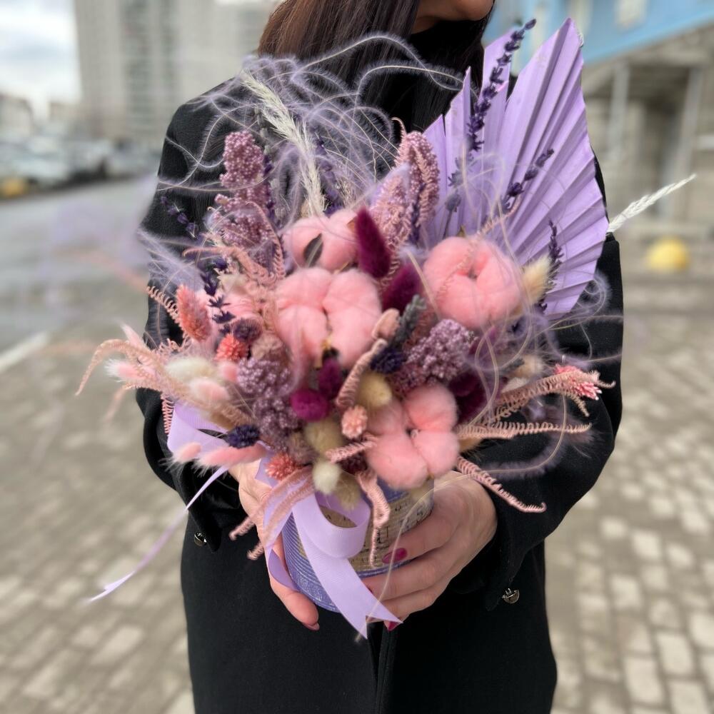 Кашпо – 1 шт.Лента атласная – 2 шт.Оазис флористический – 1 шт.пальма сухоцвет – 1 шт.Стифа – 7 шт.Лаванда – 15 шт.Хлопок – 5 шт.ягоды искусственные – 5 шт.Лагурус – 65 шт.