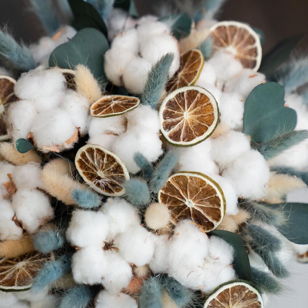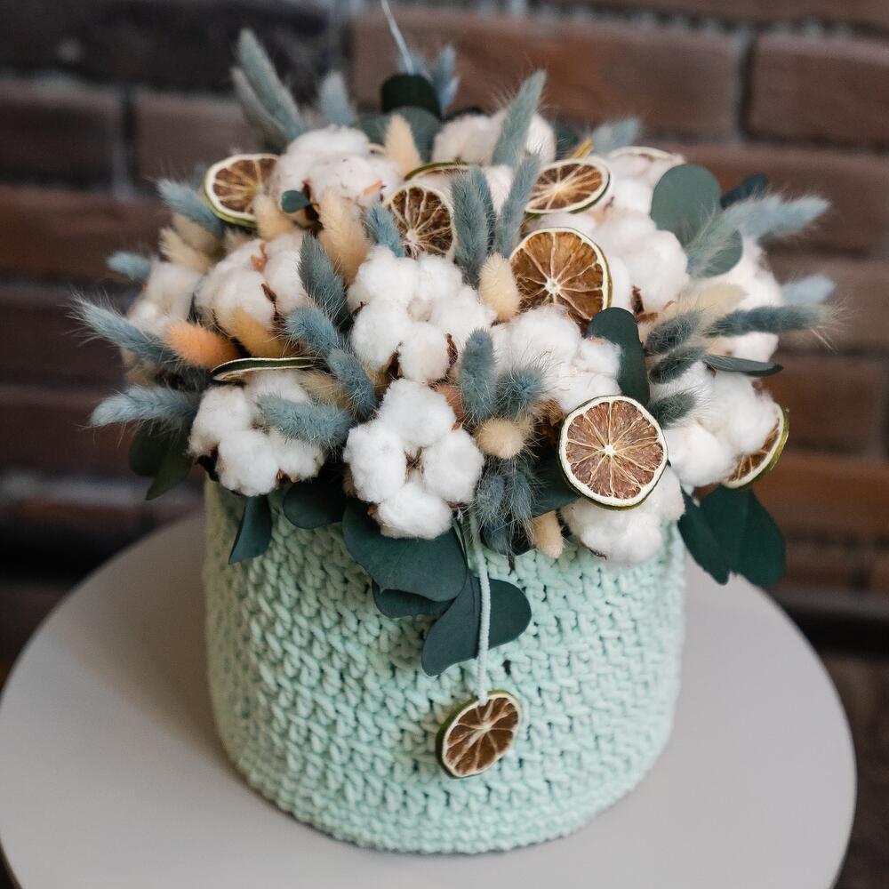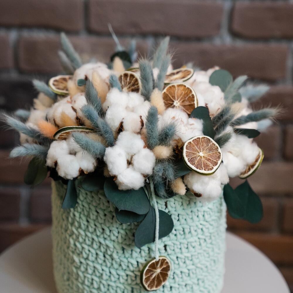Хлопок натуральный – 25 шт.Эвкалипт стабилизированный – 3 шт.Лагурус (сухоцвет) – 30 шт.Шляпная коробка – 1 шт.дольки лайма – 15 шт.вязанка ручной работы – 1 шт.
