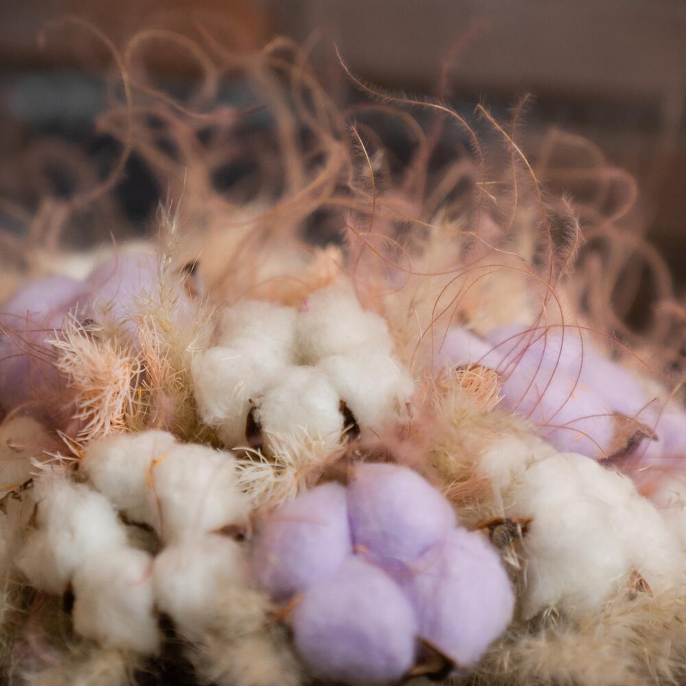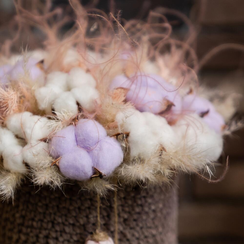 Хлопок натуральный – 25 шт.Ковыль – 30 шт.аспарагус стабилизированный – 5 шт.Шляпная коробка – 1 шт.обвязка ручной работы – 1 шт.