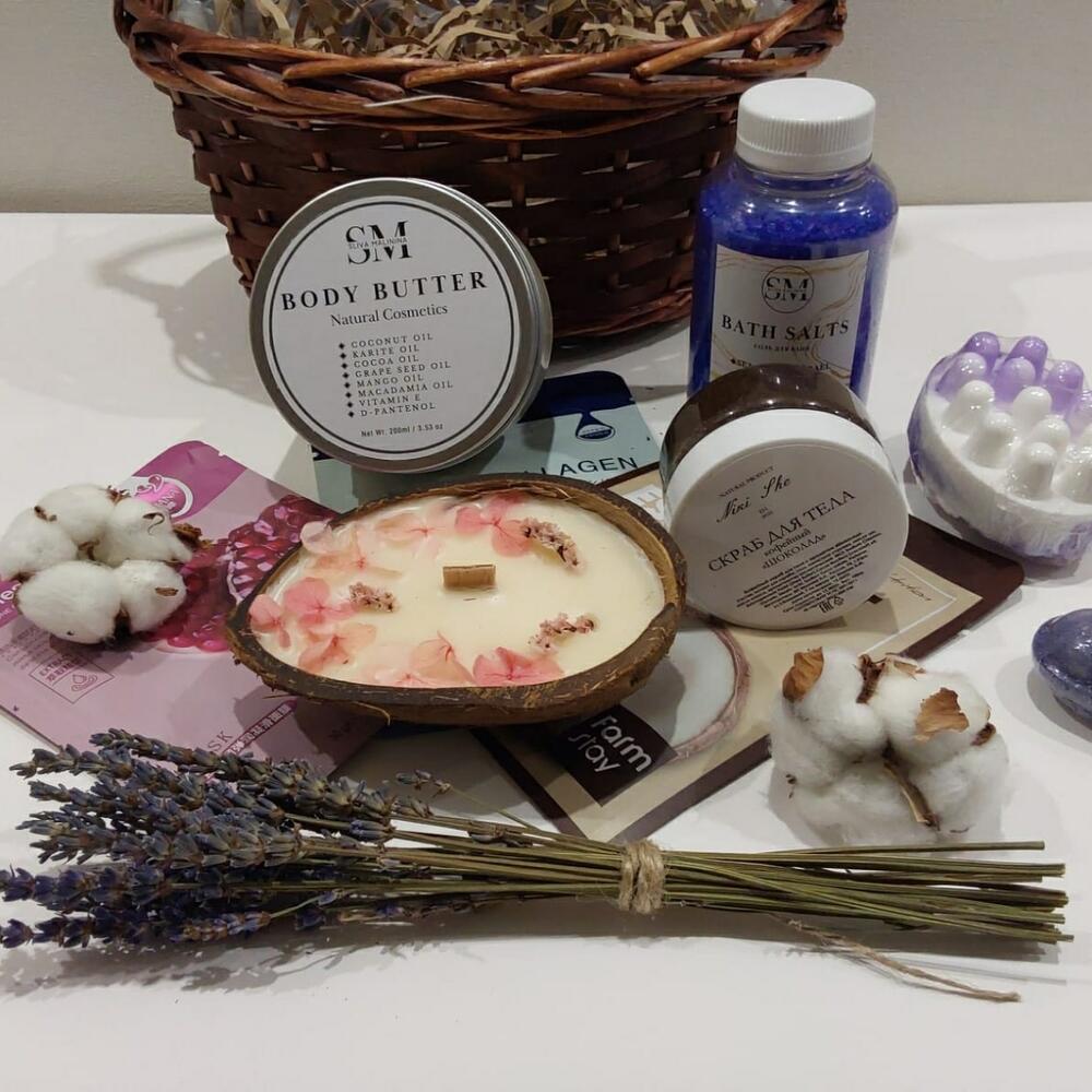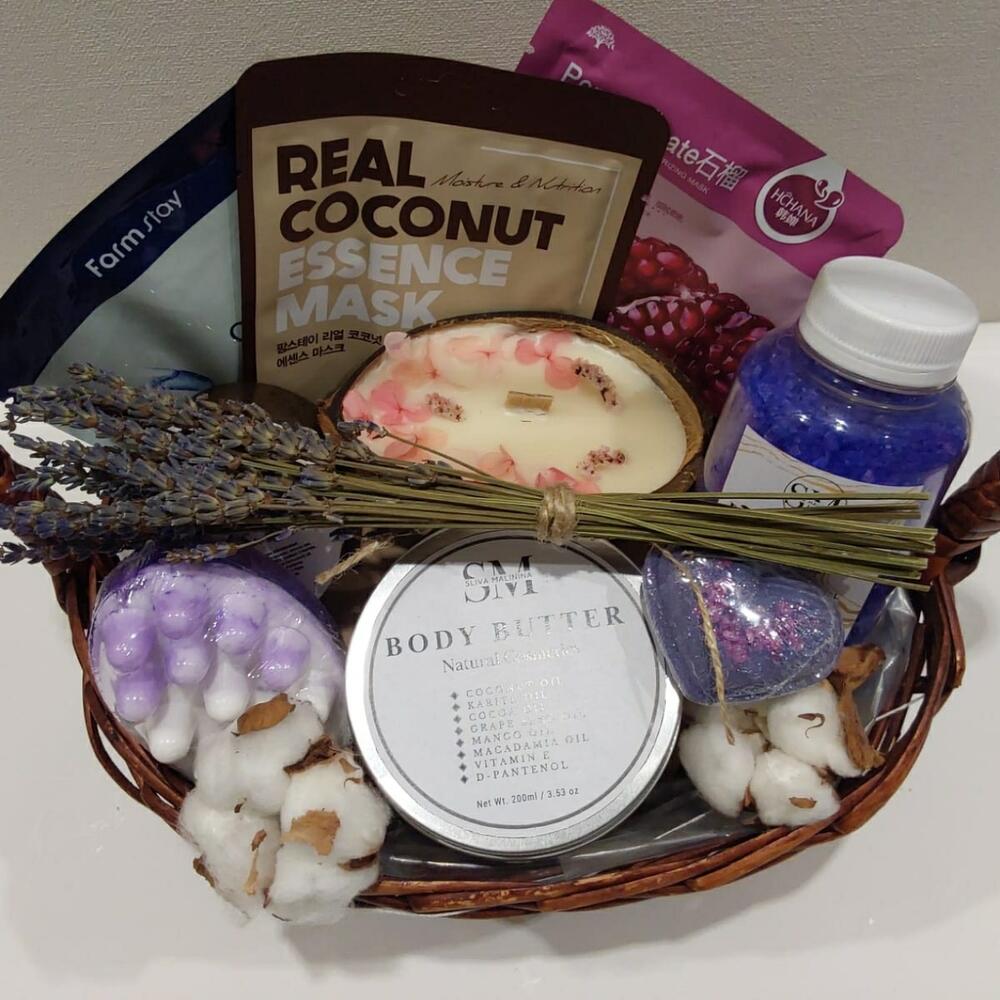 Корзина плетеная – 1 шт.Хлопок натуральный – 2 шт.Лаванда (сухоцвет) – 1 шт.свеча в кокосовой скорлупе – 1 шт.скраб для тела – 1 шт.крем баттер для тела – 1 шт.Маска для лица – 3 шт.мыло массажное ручной работы – 1 шт.Бомбочка для ванной – 1 шт.Упаковка транспортировочная пленка – 1 шт.