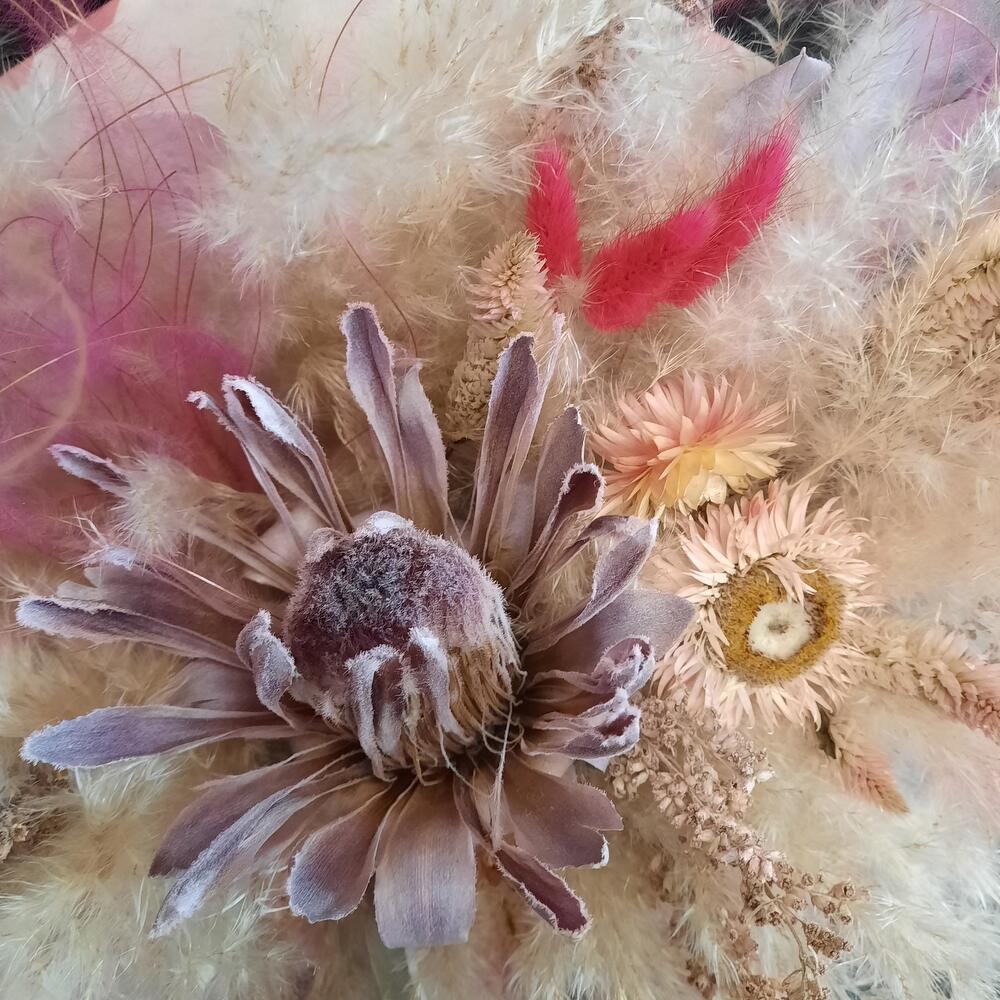 Целозия – 1 шт.Лента атласная – 6 шт.Коробка шляпная – 1 шт.Ковыль – 2 шт.Лагурус – 6 шт.Оазис флористический – 1 шт.Бессмертник – 6 шт.кортадерия – 1 шт.протея сухоцвет – 1 шт.