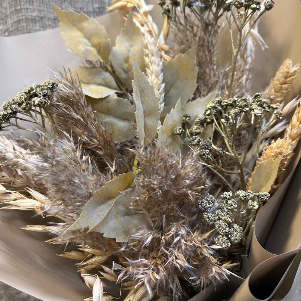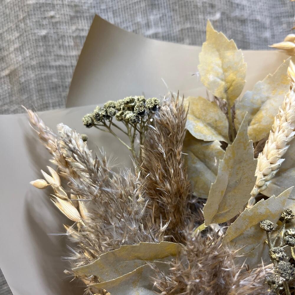 Лента атласная – 1 шт.Пшеница – 10 шт.Овес – 5 шт.Корейская упаковка – 1 шт.тысячелистник сухоцвет – 3 шт.искуственные листья – 3 шт.злак метелка – 5 шт.