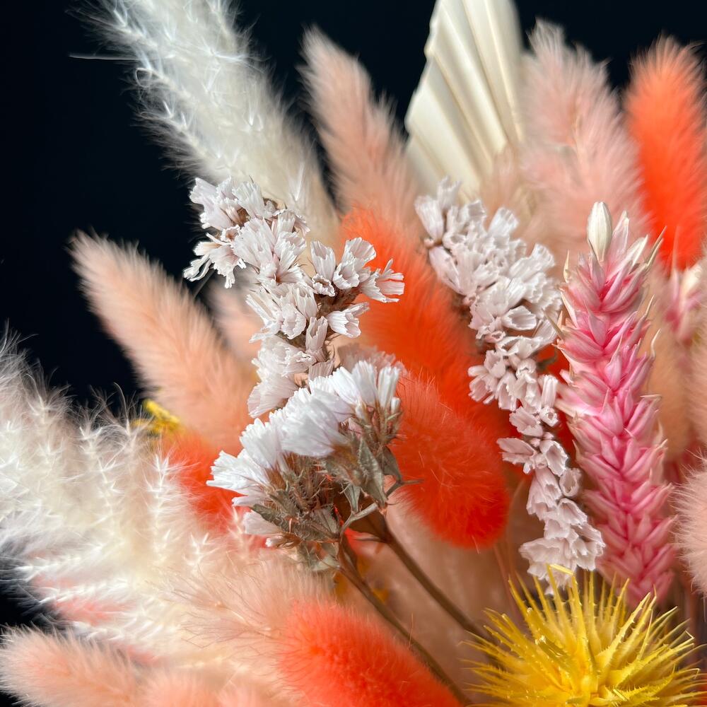 Лагурус (сухоцвет) – 80 шт.ворсянка сухоцвет – 4 шт.статица стабилизированная – 5 шт.пальма сухоцвет – 2 шт.Колосья пшеницы – 10 шт.пампас мини – 3 шт.