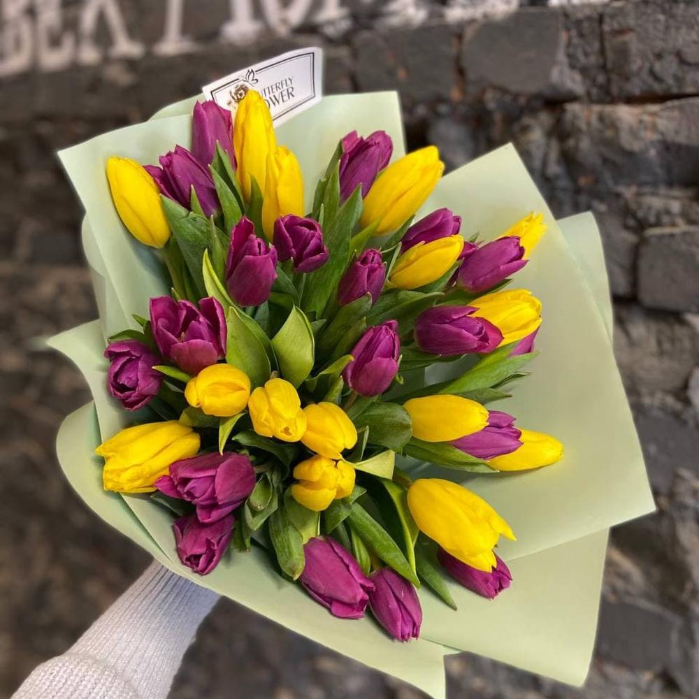 Букет из 35 желтых и фиолетовых тюльпанов “Элбург”