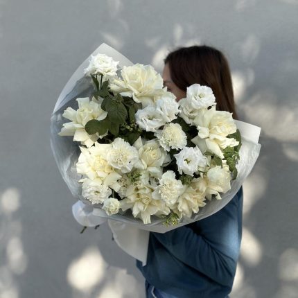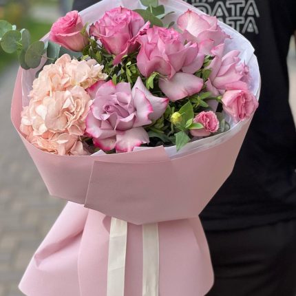 Евро-Букет из Гортензии ,Розовых Роз,Лизиантусов и Эвкалипта + открытка ручной работы в подарок